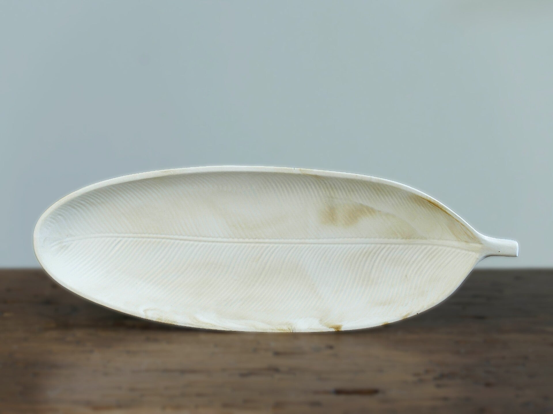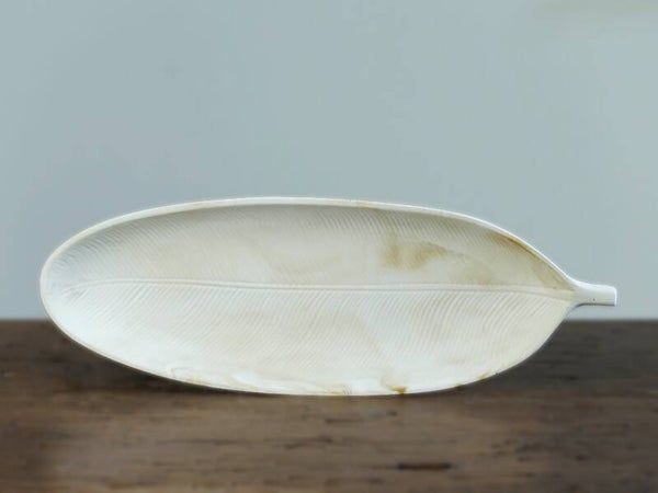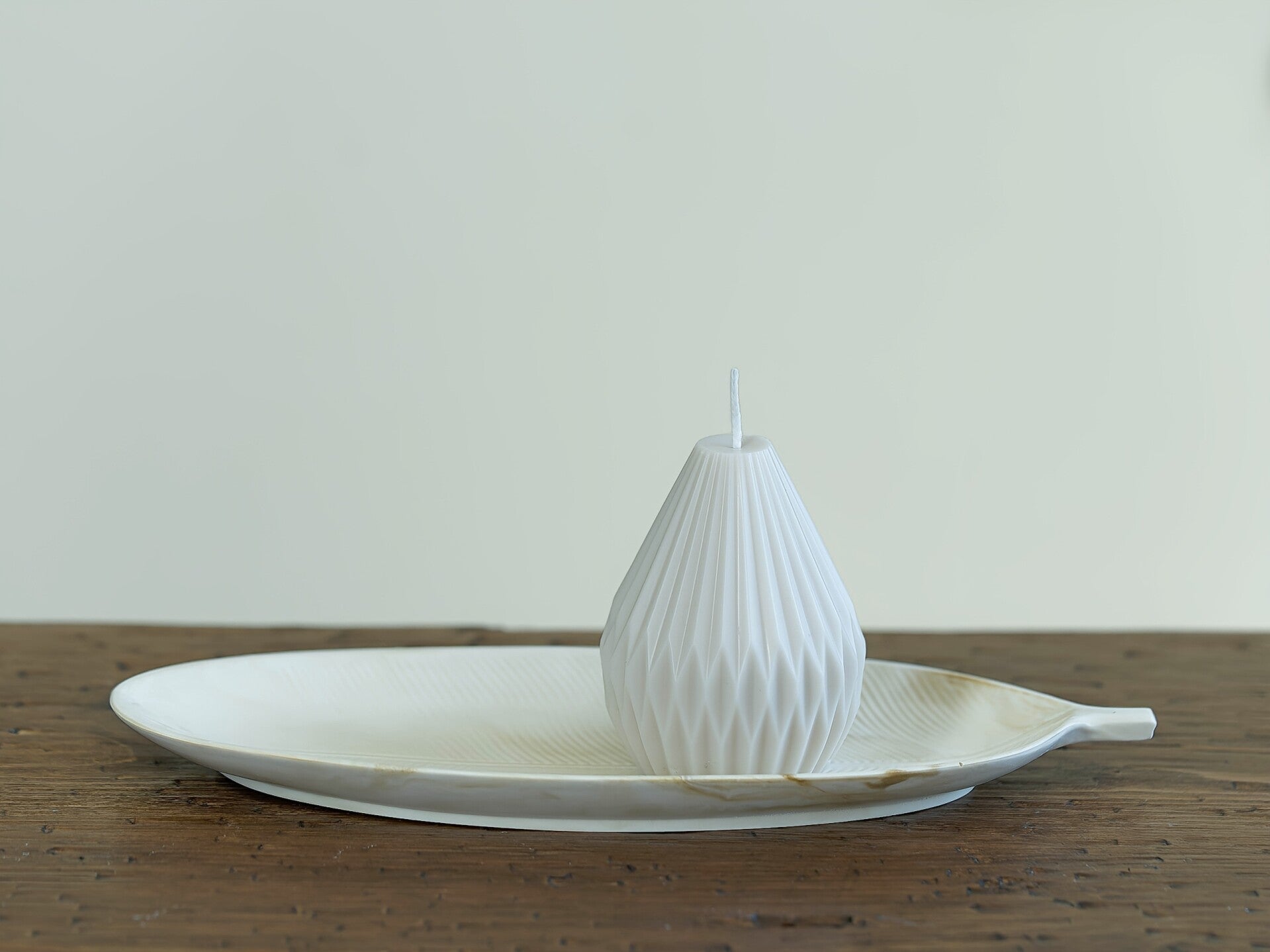 Schaaltje in de vorm van een blad in het kleur gemarmerd taupe met bijhorende decoratieve peervormige kaars