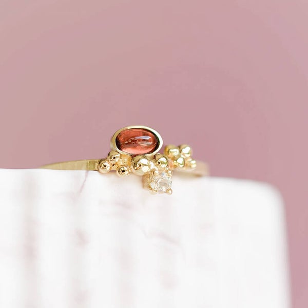 Elegante verlovingsring in 18kt geel goud met een ovale rhodoliet en
