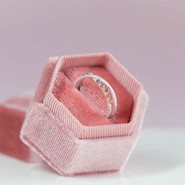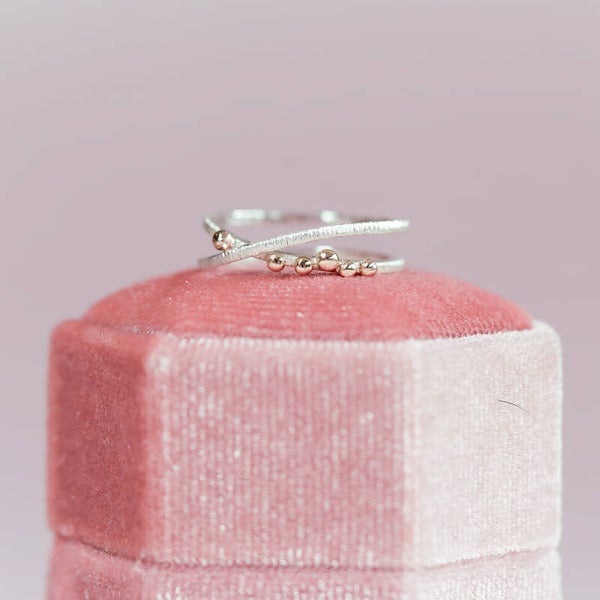 Een twistring in 925 sterling zilver met 14kt roze gouden bolletjes als detal