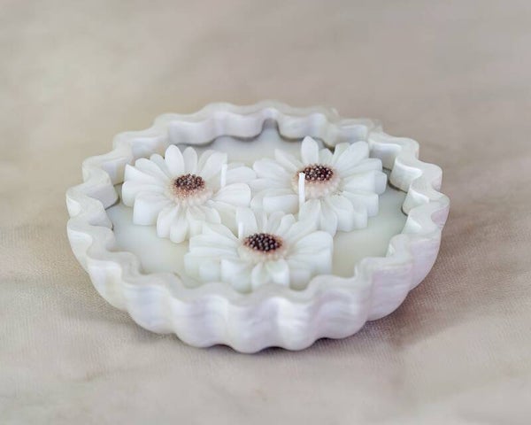 Mooie decoratieve wave schaal gevuld met geurkaars, gedecoreerd met bloemen.
